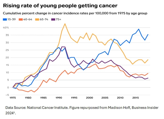 Of great concern, recent data indicate a rise in the incidence of “early-onset” cancers among adolescents and young adults, with gastrointestinal cancers in people under 50 increasing significantly12-14. Additionally, the prevalence of several types of common cancers – including breast, prostate, and pancreatic cancer – has also risen15-17.